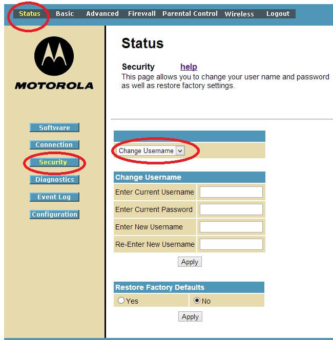 Select Status -> Security and use the drop down box to either change the username or the password. Note that you will need the “current” login information to make any changes. However, with the factory reset your default SBG6580 user and password combination would be (admin/motorola).